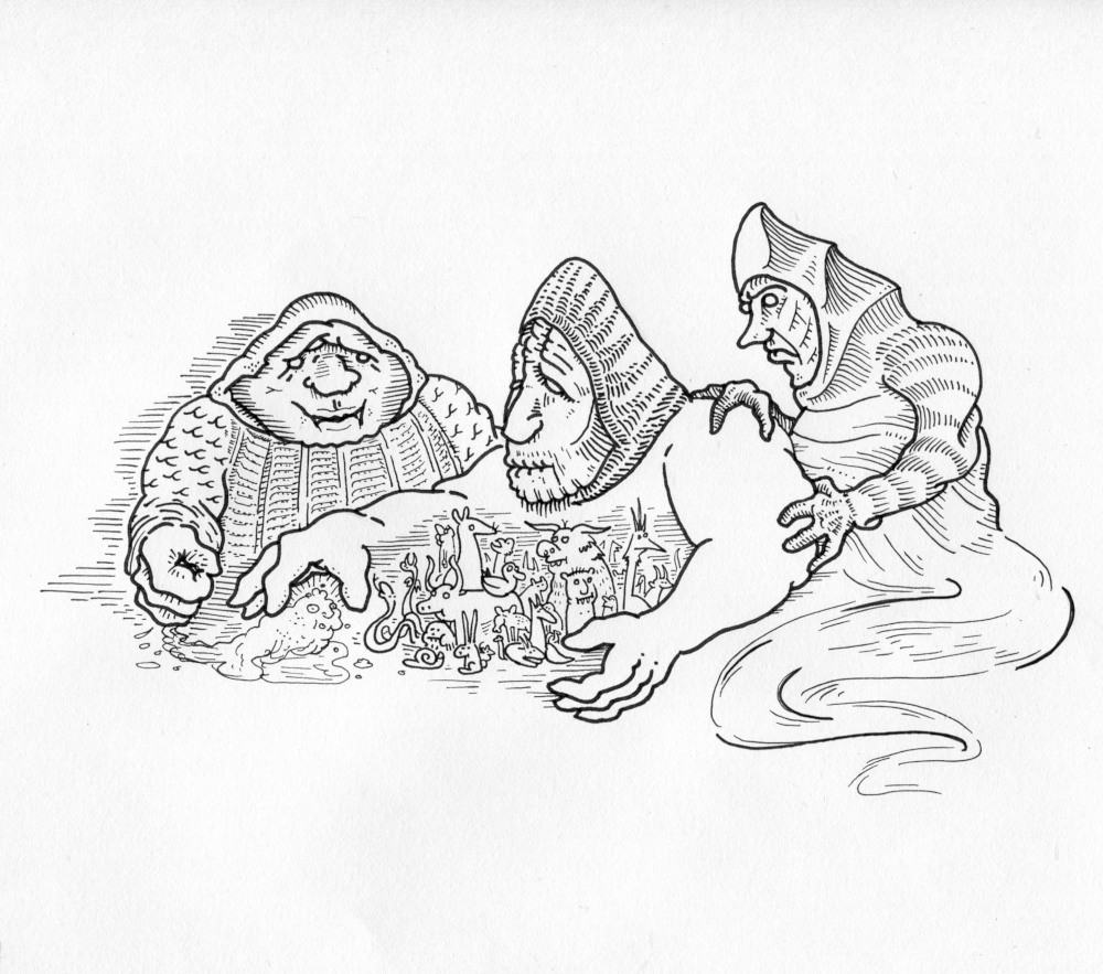 But Alffedroomt* was jealous. Even though it was the first to make creatures, they were all blind and scaly… Mean-tempered monsters who fought and ate eachother, with hearts every bit as cold as the black seas in which they swam.