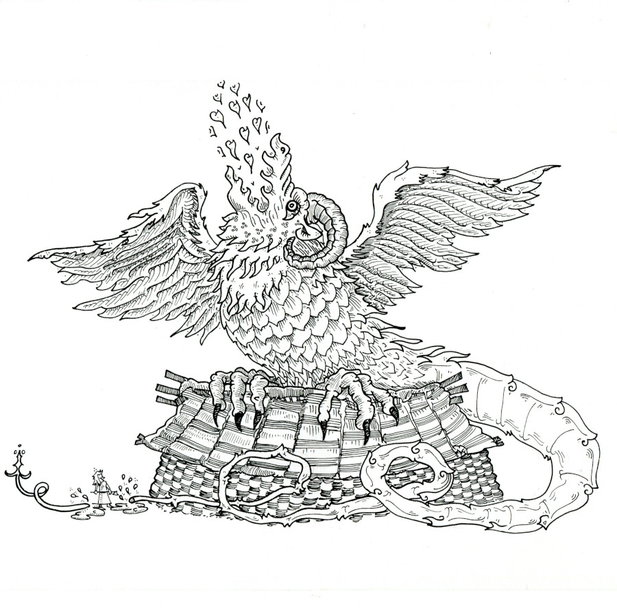 THEN ONE DAY, the manticore Nyvve flew out from a lair in the hills to patrol his lands. Soaring up high he spotted a house, dove down, and proceeded to make love to the unfortunate building. Bretta, the lady of said house, would have none of that and promptly cut off the tip of Nyvves tail. The manticore, drama king as he was, bellowed and screamed. He trashed about, wildly flailing his wings and spitting literal vinegar*! When he noticed Bretta had already gone back inside, he retreated back to his hills in shame.