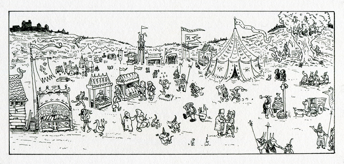 In the illustration we see the Juupla-preparations of Vrydeur#, a walled city that links the river-trade of the BrauecsseΔ to the hill-region of Vryvrankke◊. During the Juupla-period markets are held a good distance outside the walls, on the Banierschaue°, this is to not impede regular trade and to limit petty theft by light-headed party goers.