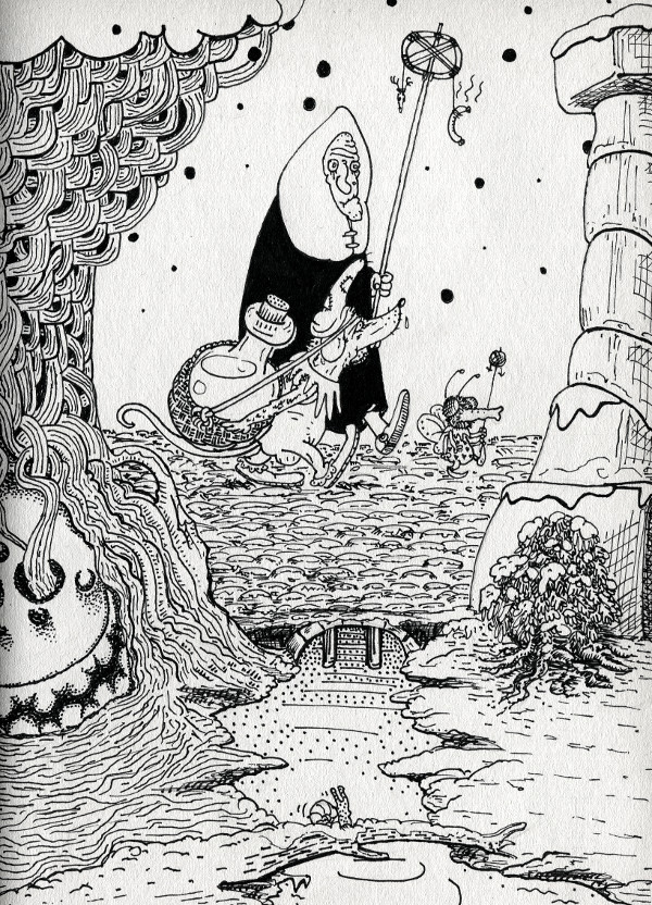 DEPICTED HERE is an elderly Enkelyntje accompanied by a serf and a Moestiek‡ (also known as a Wegwyzerke). The trio is en route to a nearby city, Gonda#, to deliver the latest batch of Sdronksoepe. The garlic-sausage is meant to ward of any Kampkiekens° they might encounter along the road.