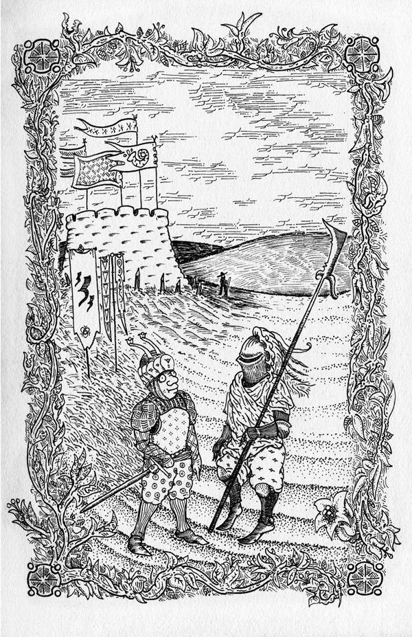 OM THE FOREGROUND of the illustration we see Grochnaert & Panduryn (and Kruytbeert in the distance)*. They are a trio of freelance guards who scout ahead of the seasonal caravans. They are momentarily posted at a Weerhuys west of Arys*. Past the hills lies the coast, where mollusc-season has begun.