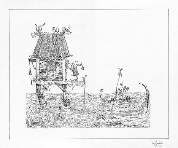 “The local Byljuuvve inspects a wonky Kootery” — in the illustration we see a local official making his rounds, and stopping by to watch a carpenter repair a fishing cabin.